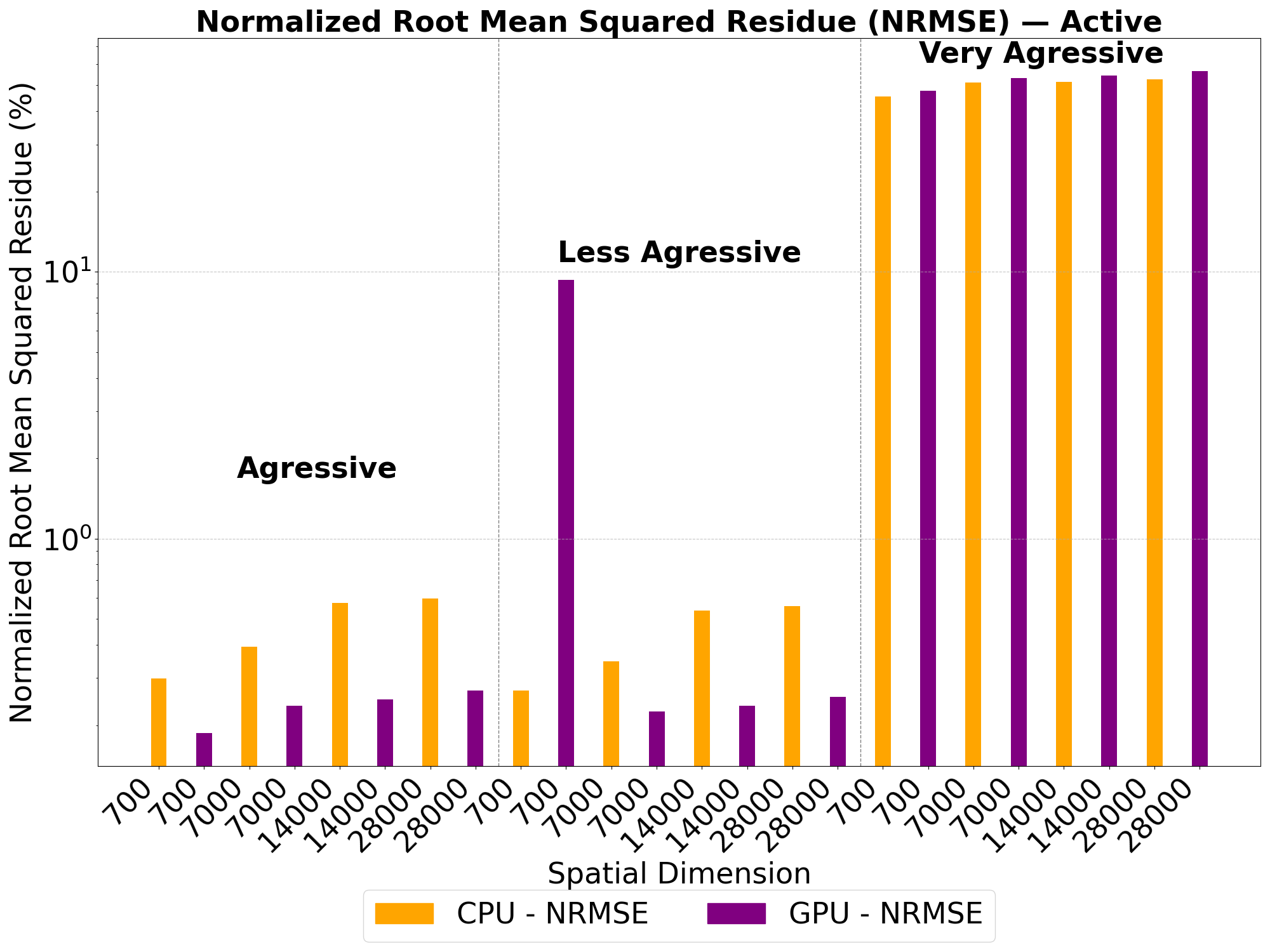 Figures 3 show that Normalized Root Mean Squared Error (NRMSE) increases with greater compression aggressiveness, reflecting the typical trade-off between data reduction and reconstruction accuracy. While aggressive compression introduces higher error, it also achieves significantly better compression ratios, which may be acceptable depending on application needs. Notably, GPU-based compression consistently results in lower NRMSE values compared to CPU implementations—especially under "Aggressive" and "Less Aggressive" settings—indicating that the GPU not only provides speed advantages but also tends to preserve data fidelity more effectively.