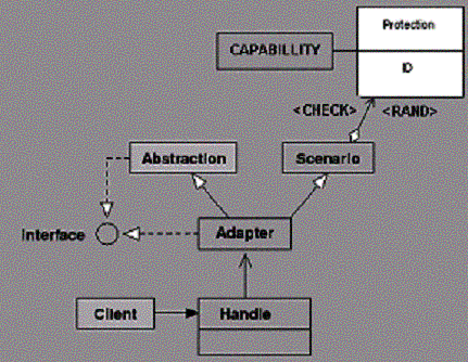 O acesso ao objeto protegido, porém, deve ser transparente ao cliente que vai acessá-lo. Isto é feito como mostrado abaixo: o “Handle” passa para o adaptador de cenário a capability restrita associada ao objeto que requer o acesso. O adaptador por sua vez, verifica através da chamada de uma rotina do aspecto Protection, se aquela capability pode acessar o objeto protegido. Ou seja, o objeto chamador acessa o objeto protegido transparentemente, sem ter que ficar passando toda a vez sua capability restrita.