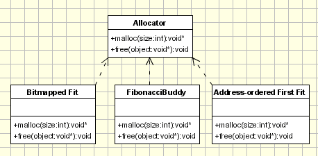 It will be implemented a dynamic memory allocator, that is to say, a allocator used for general purpose "heap'' storage, where a program can request a block of memory to store a program object, and free that block at any time. A heap, in this sense, is a pool of memory available for the allocation and deallocation of arbitrarysized blocks of memory in arbitrary order. An allocated block is typically used to store a program "object", which is some kind of structured data item such as a Pascal record, a C struct, or a C++ object, but not necessarily an object in the sense of objectoriented programming. This operation is done, for example, by the functions malloc and free and by the operators new and delete in C++ language.- Dynamic Storage Allocation: A Survey and Critical Review - pdf file - postscript file